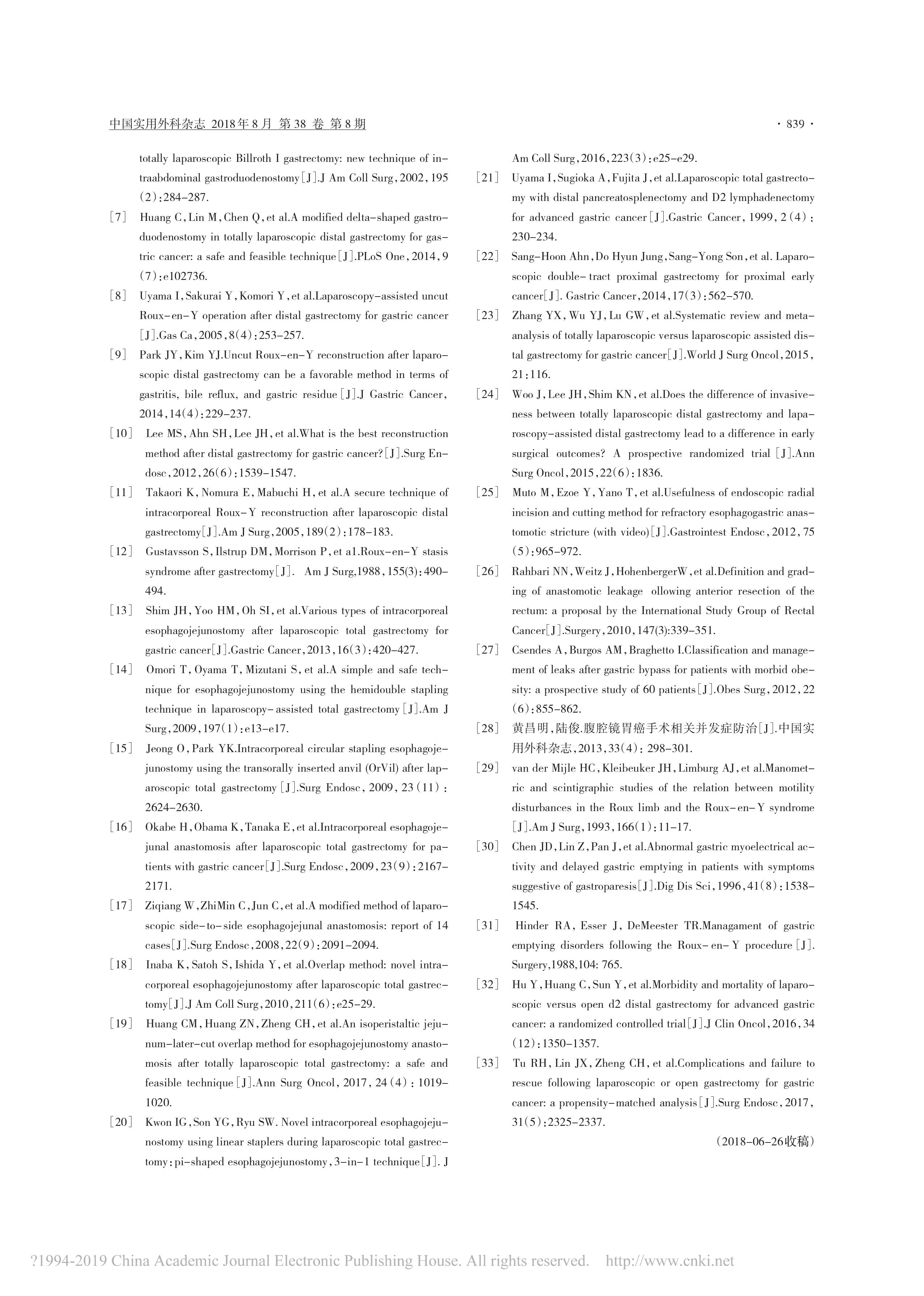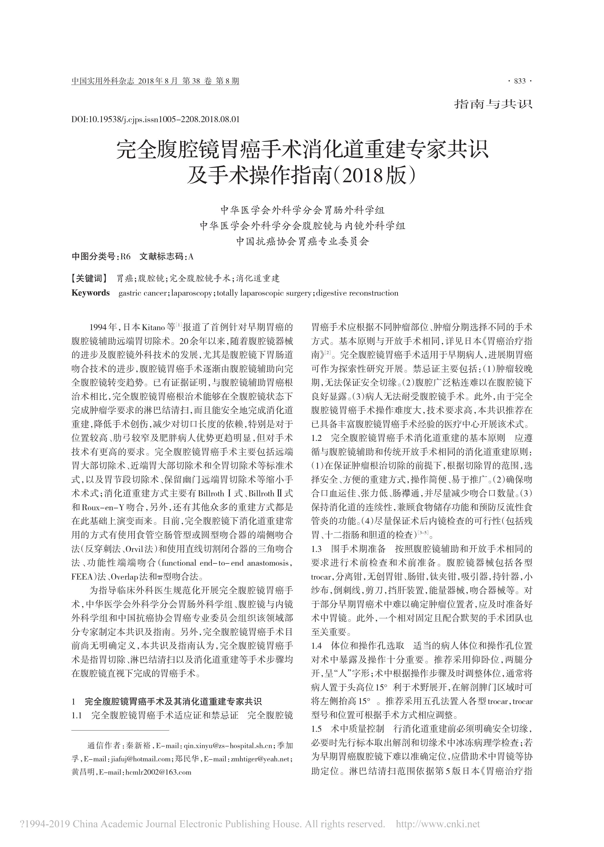 完全腹腔鏡胃癌手術(shù)消化道重建專家共識(shí)及手術(shù)操作指南(2018 版)
